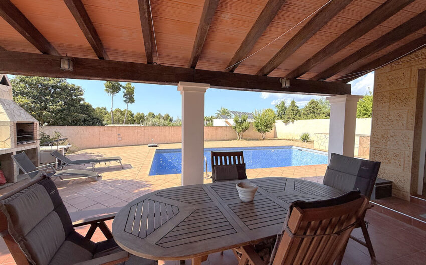 Draußen erwartet Sie eine großzügige Terrasse mit Esstisch, perfekt für Mahlzeiten im Freien oder gesellige Runden. Der große Pool, der momentan reparaturbedürftig ist, lädt zum Abkühlen ein und bietet viel Liegefläche für Sonnenliebhaber.