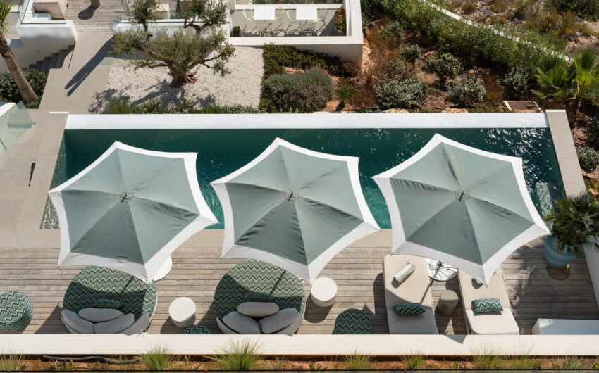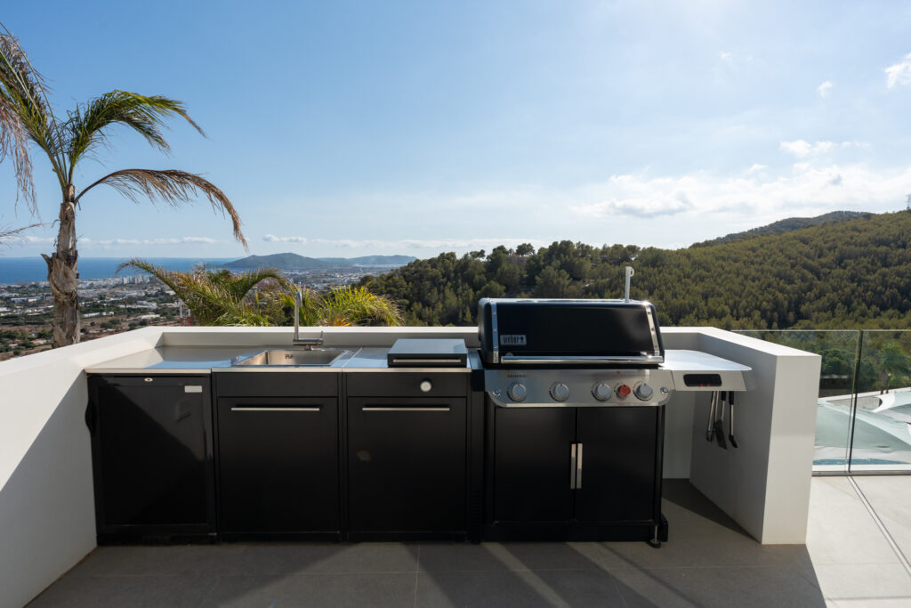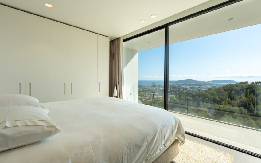 Die Villa befindet sich auf einem großzügigen Grundstück und wurde so gestaltet, dass sie möglichst viel Platz, Licht und Aussicht bietet. Große Terrassen öffnen sich von den Hauptwohnbereichen aus und bieten einen ununterbrochenen Blick auf das Mittelmeer und die Insel Formentera. Die erhöhte Lage des Grundstücks sorgt für Privatsphäre und Ruhe und ist dennoch nur fünf Autominuten vom pulsierenden Leben in Ibiza-Stadt entfernt. Die südwestliche Ausrichtung sorgt den ganzen Tag über für Sonne und die Abende enden mit unvergesslichen Sonnenuntergängen über den Bergen.