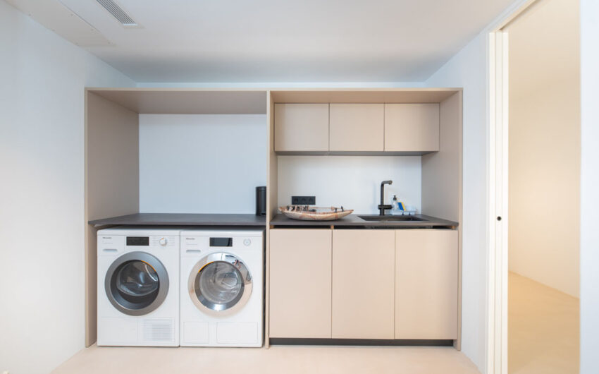 The villa offers six double bedrooms, including a luxurious master suite occupying the entire upper floor with panoramic sea views, a dressing area, exquisite bathroom, private terrace, and outdoor shower. The remaining bedrooms are generously sized and feature en-suite or nearby bathrooms, each designed for comfort and elegance. A hidden gem of the villa is the entertainment and wellness area on the ground floor, which includes a home cinema, gym, glam room, storage, guest toilet, and an additional laundry area.